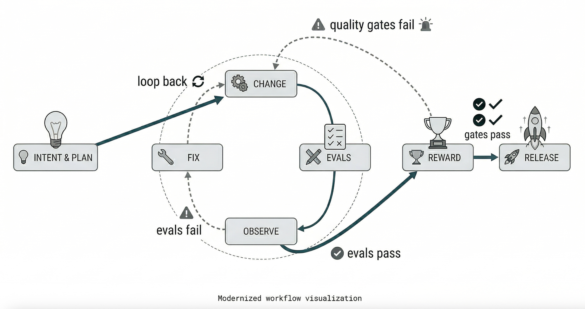 The Inner Loop: Change → Test → Observe → Fix → Check Reward → Release.